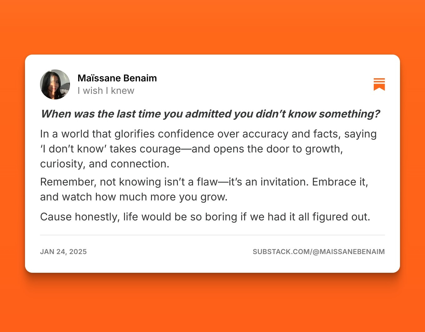The pressure to appear to know everything ties back to ego. It’s hard to admit our limits, especially in some cultures—like my own in France—where there’s a subtle (and sometimes not-so-subtle) pressure to appear knowledgeable about everything. Society itself also reinforces this. Schools and workplaces reward quick answers over thoughtful exploration, and the always-on culture has made knowing synonymous with performing.